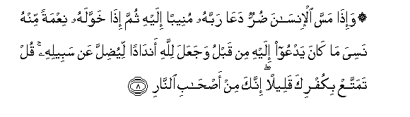 8. Wa-itha massa al-insana durrun daAAa rabbahu muneeban ilayhi thumma itha khawwalahu niAAmatan minhu nasiya ma kana yadAAoo ilayhi min qablu wajaAAala lillahi andadan liyudilla AAan sabeelihi qul tamattaAA bikufrika qaleelan innaka min as-habi alnnari