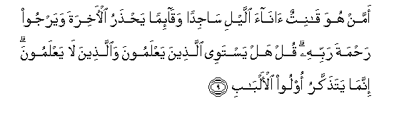 9. Amman huwa qanitun anaa allayli sajidan waqa-iman yahtharu al-akhirata wayarjoo rahmata rabbihi qul hal yastawee allatheena yaAAlamoona waallatheena la yaAAlamoona innama yatathakkaru oloo al-albabi