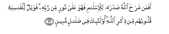 22. Afaman sharaha Allahu sadrahu lil-islami fahuwa AAala noorin min rabbihi fawaylun lilqasiyati quloobuhum min thikri Allahi ola-ika fee dalalin mubeenin