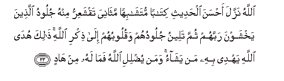 23. Allahu nazzala ahsana alhadeethi kitaban mutashabihan mathaniya taqshaAAirru minhu juloodu allatheena yakhshawna rabbahum thumma taleenu julooduhum waquloobuhum ila thikri Allahi thalika huda Allahi yahdee bihi man yashao waman yudlili Allahu fama lahu min hadin