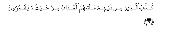 25. Kaththaba allatheena min qablihim faatahumu alAAathabu min haythu la yashAAuroona