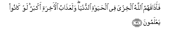 26. Faathaqahumu Allahu alkhizya fee alhayati alddunya walaAAathabu al-akhirati akbaru law kanoo yaAAlamoona