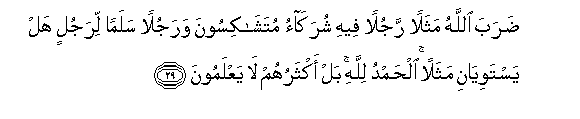 29. Daraba Allahu mathalan rajulan feehi shurakao mutashakisoona warajulan salaman lirajulin hal yastawiyani mathalan alhamdu lillahi bal aktharuhum la yaAAlamoona