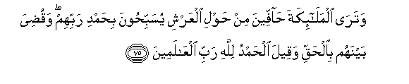 75. Watara almala-ikata haffeena min hawli alAAarshi yusabbihoona bihamdi rabbihim waqudiya baynahum bialhaqqi waqeela alhamdu lillahi rabbi alAAalameena
