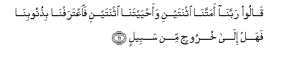 11. Qaloo rabbana amattana ithnatayni waahyaytana ithnatayni faiAAtarafna bithunoobina fahal ila khuroojin min sabeelin
