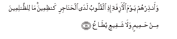18. Waanthirhum yawma al-azifati ithi alquloobu lada alhanajiri kathimeena ma lilththalimeena min hameemin wala shafeeAAin yutaAAu
