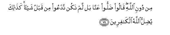 74. Min dooni Allahi qaloo dalloo AAanna bal lam nakun nadAAoo min qablu shay-an kathalika yudillu Allahu alkafireena