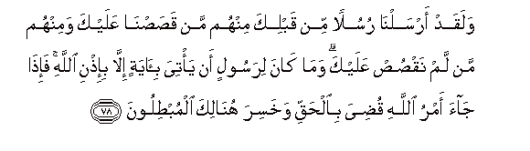 78. Walaqad arsalna rusulan min qablika minhum man qasasna AAalayka waminhum man lam naqsus AAalayka wama kana lirasoolin an ya/tiya bi-ayatin illa bi-ithni Allahi fa-itha jaa amru Allahi qudiya bialhaqqi wakhasira hunalika almubtiloona
