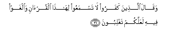 26. Waqala allatheena kafaroo la tasmaAAoo lihatha alqur-ani wailghaw feehi laAAallakum taghliboona
