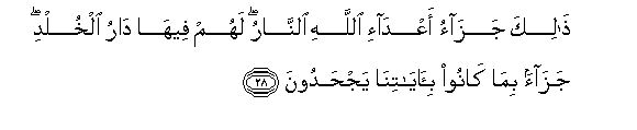 28. Thalika jazao aAAda-i Allahi alnnaru lahum feeha daru alkhuldi jazaan bima kanoo bi-ayatina yajhadoona