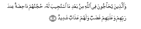 16. Waallatheena yuhajjoona fee Allahi min baAAdi ma istujeeba lahu hujjatuhum dahidatun AAinda rabbihim waAAalayhim ghadabun walahum AAathabun shadeedun