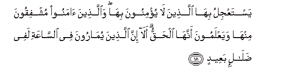18. YastaAAjilu biha allatheena la yu/minoona biha waallatheena amanoo mushfiqoona minha wayaAAlamoona annaha alhaqqu ala inna allatheena yumaroona fee alssaAAati lafee dalalin baAAeedin