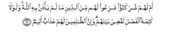 21. Am lahum shurakao sharaAAoo lahum mina alddeeni ma lam ya/than bihi Allahu walawla kalimatu alfasli laqudiya baynahum wa-inna alththalimeena lahum AAathabun aleemun