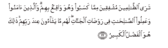 22. Tara alththalimeena mushfiqeena mimma kasaboo wahuwa waqiAAun bihim waallatheena amanoo waAAamiloo alssalihati fee rawdati aljannati lahum ma yashaoona AAinda rabbihim thalika huwa alfadlu alkabeeru
