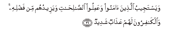 26. Wayastajeebu allatheena amanoo waAAamiloo alssalihati wayazeeduhum min fadlihi waalkafiroona lahum AAathabun shadeedun