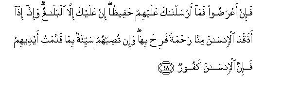 48. Fa-in aAAradoo fama arsalnaka AAalayhim hafeethan in AAalayka illa albalaghu wa-inna itha athaqna al-insana minna rahmatan fariha biha wa-in tusibhum sayyi-atun bima qaddamat aydeehim fa-inna al-insana kafoorun