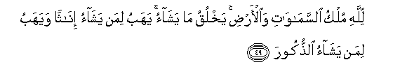 49. Lillahi mulku alssamawati waal-ardi yakhluqu ma yashao yahabu liman yashao inathan wayahabu liman yashao alththukoora