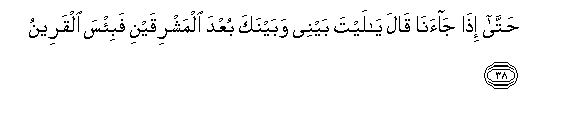 38. Hatta itha jaana qala ya layta baynee wabaynaka buAAda almashriqayni fabi/sa alqareenu
