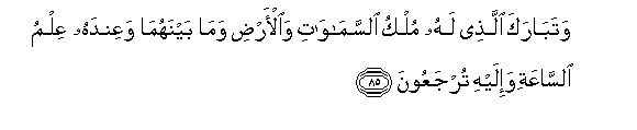 85. Watabaraka allathee lahu mulku alssamawati waal-ardi wama baynahuma waAAindahu AAilmu alssaAAati wa-ilayhi turjaAAoona