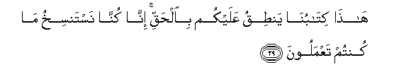 29. Hatha kitabuna yantiqu AAalaykum bialhaqqi inna kunna nastansikhu ma kuntum taAAmaloona