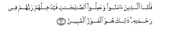 30. Faamma allatheena amanoo waAAamiloo alssalihati fayudkhiluhum rabbuhum fee rahmatihi thalika huwa alfawzu almubeenu