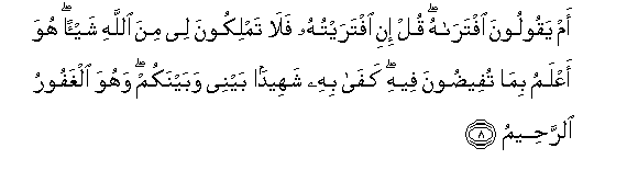 8. Am yaqooloona iftarahu qul ini iftaraytuhu fala tamlikoona lee mina Allahi shay-an huwa aAAlamu bima tufeedoona feehi kafa bihi shaheedan baynee wabaynakum wahuwa alghafooru alrraheemu