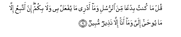 9. Qul ma kuntu bidAAan mina alrrusuli wama adree ma yufAAalu bee wala bikum in attabiAAu illa ma yooha ilayya wama ana illa natheerun mubeenun