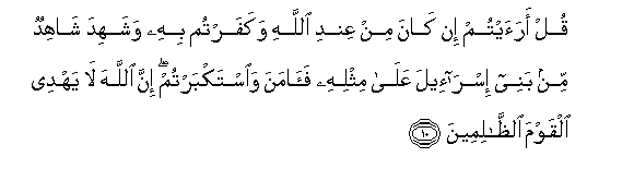 10. Qul araaytum in kana min AAindi Allahi wakafartum bihi washahida shahidun min banee isra-eela AAala mithlihi faamana waistakbartum inna Allaha la yahdee alqawma alththalimeena