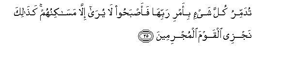 25. Tudammiru kulla shay-in bi-amri rabbiha faasbahoo la yura illa masakinuhum kathalika najzee alqawma almujrimeena