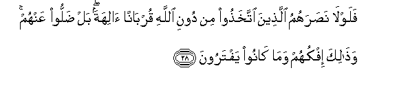 28. Falawla nasarahumu allatheena ittakhathoo min dooni Allahi qurbanan alihatan bal dalloo AAanhum wathalika ifkuhum wama kanoo yaftaroona