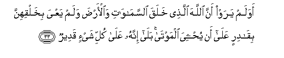 33. Awa lam yaraw anna Allaha allathee khalaqa alssamawati waal-arda walam yaAAya bikhalqihinna biqadirin AAala an yuhyiya almawta bala innahu AAala kulli shay-in qadeerun