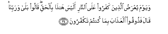 34. Wayawma yuAAradu allatheena kafaroo AAala alnnari alaysa hatha bialhaqqi qaloo bala warabbina qala fathooqoo alAAathaba bima kuntum takfuroona
