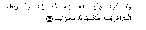 13. Wakaayyin min qaryatin hiya ashaddu quwwatan min qaryatika allatee akhrajatka ahlaknahum fala nasira lahum