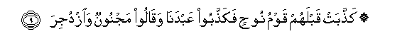 9. Kaththabat qablahum qawmu noohin fakaththaboo AAabdana waqaloo majnoonun waizdujira