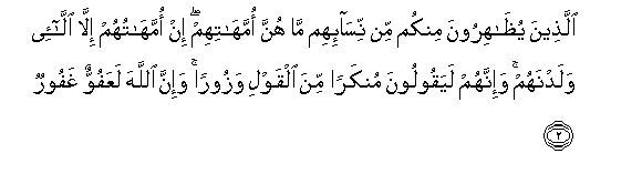 2. Allatheena yuthahiroona minkum min nisa-ihim ma hunna ommahatihim in ommahatuhum illa alla-ee waladnahum wa-innahum layaqooloona munkaran mina alqawli wazooran wa-inna Allaha laAAafuwwun ghafoorun