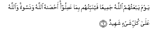 6. Yawma yabAAathuhumu Allahu jameeAAan fayunabbi-ohum bima AAamiloo ahsahu Allahu wanasoohu waAllahu AAala kulli shay-in shaheedun