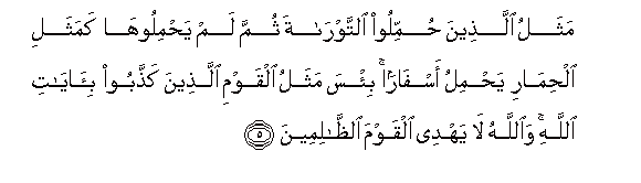 5. Mathalu allatheena hummiloo alttawrata thumma lam yahmilooha kamathali alhimari yahmilu asfaran bi/sa mathalu alqawmi allatheena kaththaboo bi-ayati Allahi waAllahu la yahdee alqawma alththalimeena