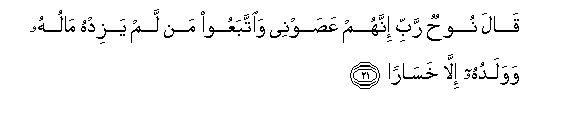 21. Qala noohun rabbi innahum AAasawnee waittabaAAoo man lam yazidhu maluhu wawaladuhu illa khasaran