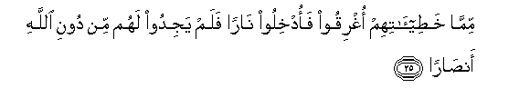 25. Mimma khatee-atihim oghriqoo faodkhiloo naran falam yajidoo lahum min dooni Allahi ansaran