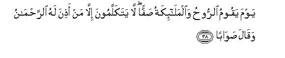38. Yawma yaqoomu alrroohu waalmala-ikatu saffan la yatakallamoona illa man athina lahu alrrahmanu waqala sawaban