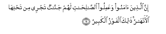 11. Inna allatheena amanoo waAAamiloo alssalihati lahum jannatun tajree min tahtiha al-anharu thalika alfawzu alkabeeru