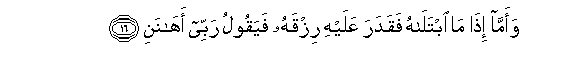 16. Waamma itha ma ibtalahu faqadara AAalayhi rizqahu fayaqoolu rabbee ahanani