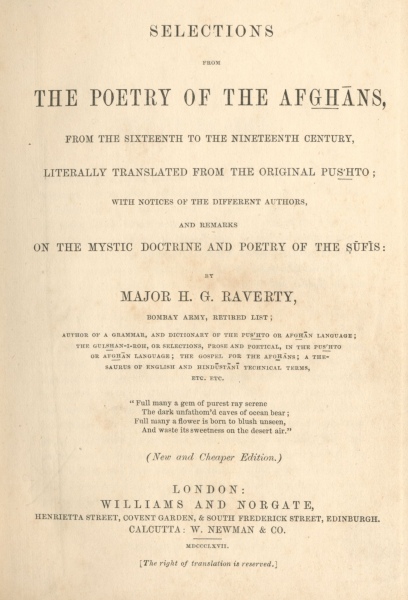 Selections from the Poetry of the Afghans, by H.G. Raverty, [1868], at sacred-texts.com