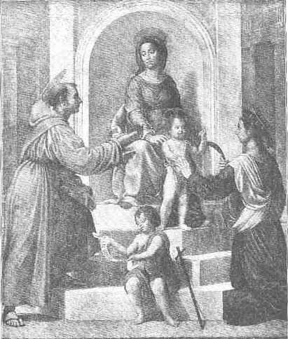 | THE MARRIAGE OF ST. CATHARINE. By Fra Bartolommeo, 1475-1517. (Louvre.) Because of the nun's habit this can only be Catharine of Siena. |