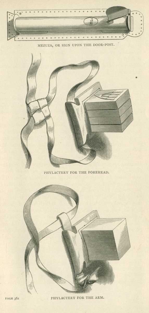 [paragraph continues] Babylonian captivity, the Rabbinical Jews insist upon their literal meaning, and they enjoin the wearing of Phylacteries (φυλακτήρια, preservatives, Matt. xxiii. 5), upon the forehead and arm of the worshipper. Phylacteries, called in Hebrew Tephillin (from Palal to pray) are, firstly, one for the forehead (Rev. xiv. 1). It is a leathern box which contains four compartments, in which are enclosed four portions of the Law written on parchment, and carefully folded. This box is made of leather, pressed upon blocks of wood specially prepared for the purpose, while the leather is well soaked in water. When it is dry and ready for use, the following passages of the law are sewn into it(Ex. xiii. 1-10,11-16; Deut. vi. 4-9; xi. 13-21). On this box there is also impressed the letter ש (Shin), with three strokes for the right hand side of the wearer, and also the same letter with four strokes for the left hand side of the wearer. Secondly, there is another leathern box, without any ש (Shin), for the arm of the worshipper, and with only one compartment, into which the same passages of Scripture are sewn with the sinews of animals, specially prepared for this object. The phylacteries are bound on the forehead and arm by long leathern straps (Rtsuoth) which pass through the Maabarta, or passages in their sides. The straps round the head must be tied in a knot shaped like the letter ד (Daleth). And the straps on the arm must be long enough to go round it seven times, and three times round the middle finger, with a small surplus over in the form of the letter י (Yod). There is thus formed by the letter Shin on the phylactery, and by the knot Daleth on the back of the head, and by the Yod on the hand the word Shaddai, or Almighty. This is said to fulfil the text, "And all people of the earth shall see that thou art called by the name of the Lord (or as the Rabbis say, 'the name of the Lord is read upon thee'), and they shall be afraid of thee" (Deut. xxviii. 10). The time for putting on the phylacteries is during the day, at the time of prayer and reading of the Shema, or "Hear O Israel," etc. (Deut. vi. 4, etc.) They are not to be worn at night, on the Sabbath, or on the festival days, because it is said, "And it shall be for a sign"