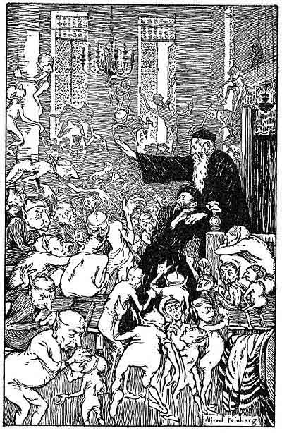 A strange crowd of demons of all shapes and sizes poured into the synagogue with threatening gestures. (Page 49).