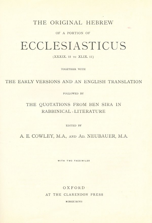 Original Hebrew of a Portion of Ecclesiasticus, by A.E. Cowley and A. Neubauer, [1897], at sacred-texts.com