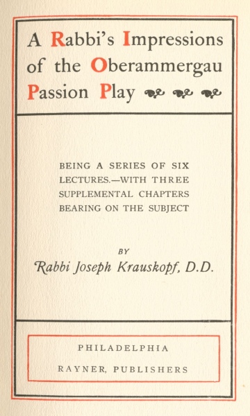 A Rabbi's Impressions of the Oberammergau Passion Play, by Joseph Krauskopf, [1901], at sacred-texts.com