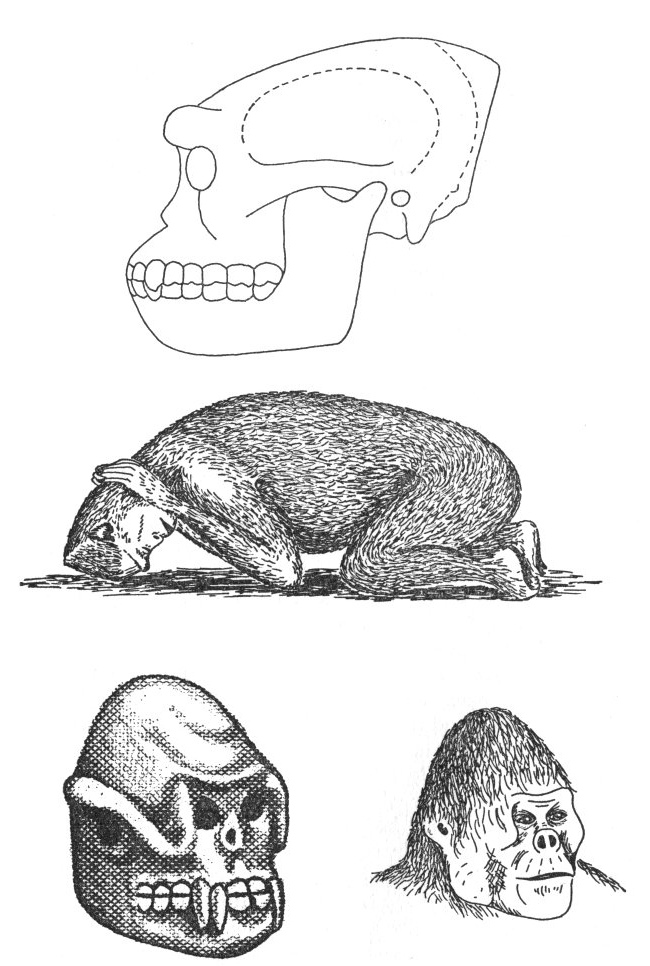 "This creature seldom issued any sounds and usually was quiet and silent. Only when approached she bared her teeth and screeched. It [sic] had a peculiar way of lying down, or sleeping—like a camel, by squatting on the ground on its knees and elbows, resting the forehead on the ground, and resting the wrists on the back of the head [see p. 316]. This position accounts for the unusually hard skin of the elbows and knees—like camel's soles. When offered food, the female ate only raw meat, some vegetables and grain. She did not touch cooked