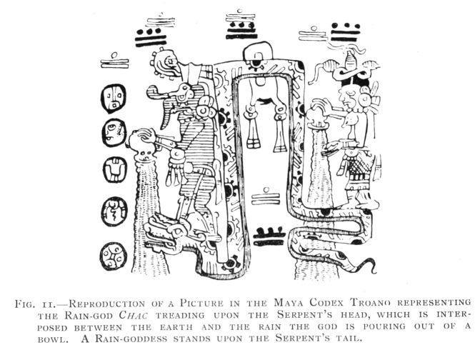 FIG. 11.REPRODUCTION OF A PICTURE IN THE MAYA CODEX TROANO REPRESENTING THE RAIN-GOD CHAC TREADING UPON THE SERPENT'S HEAD, WHICH IS INTERPOSED BETWEEN THE EARTH AND THE RAIN THE GOD IS POURING OUT OF A BOWL. A RAIN-GODDESS STANDS UPON THE SERPENT'S TAIL.